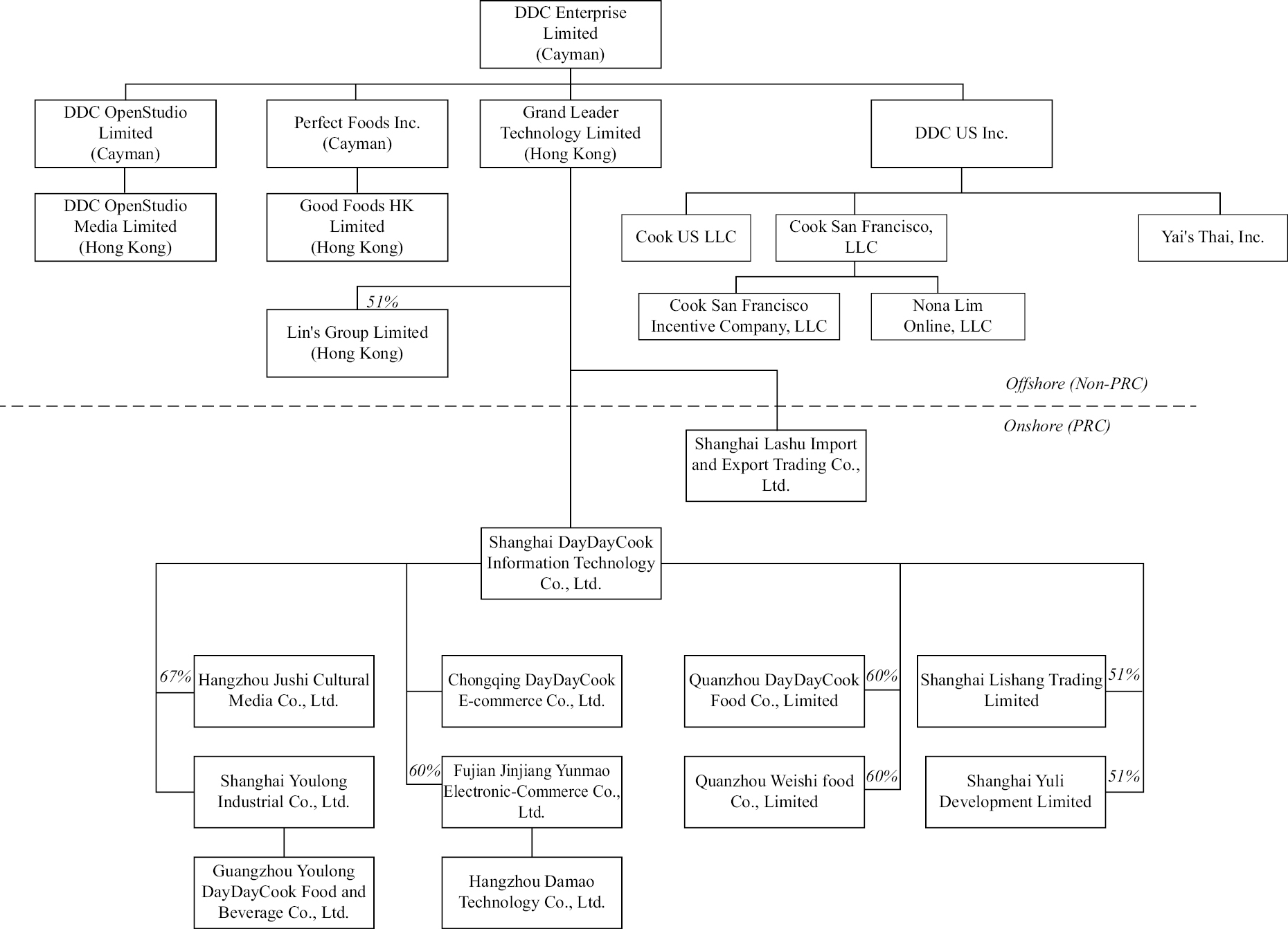 We were founded in Hong Kong in 2012 by Ms. Norma Ka Yin Chu, a highly regarded entrepreneur and a true cooking enthusiast, as an online platform which distributed food recipes and culinary content. Subsequently, we further expanded our business to provide advertising services to brands that wish to place advertisements on our platform or video content. In 2015, we entered the Mainland China market through the establishment of DDC Shanghai to engage in technology development of computer software, food circulation and advertising production in China. In 2017, we started expanded our business from content creation to content commerce. Later in 2019, we extended our business to include the production and sale of, among others, own-branded RTH, RTC convenient meal solution products.